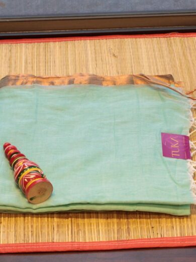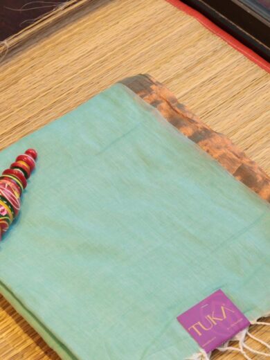 Elegant Sea Green Mul Cotton Handloom Saree with Copper Border & Tassel Detailing