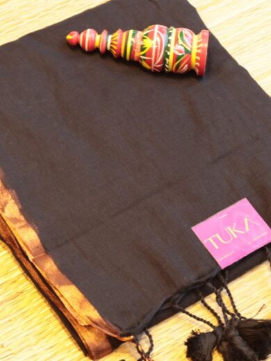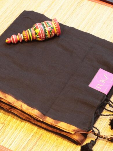 Elegant Black Mul Cotton Handloom Saree with Copper Border & Tassel Pallu