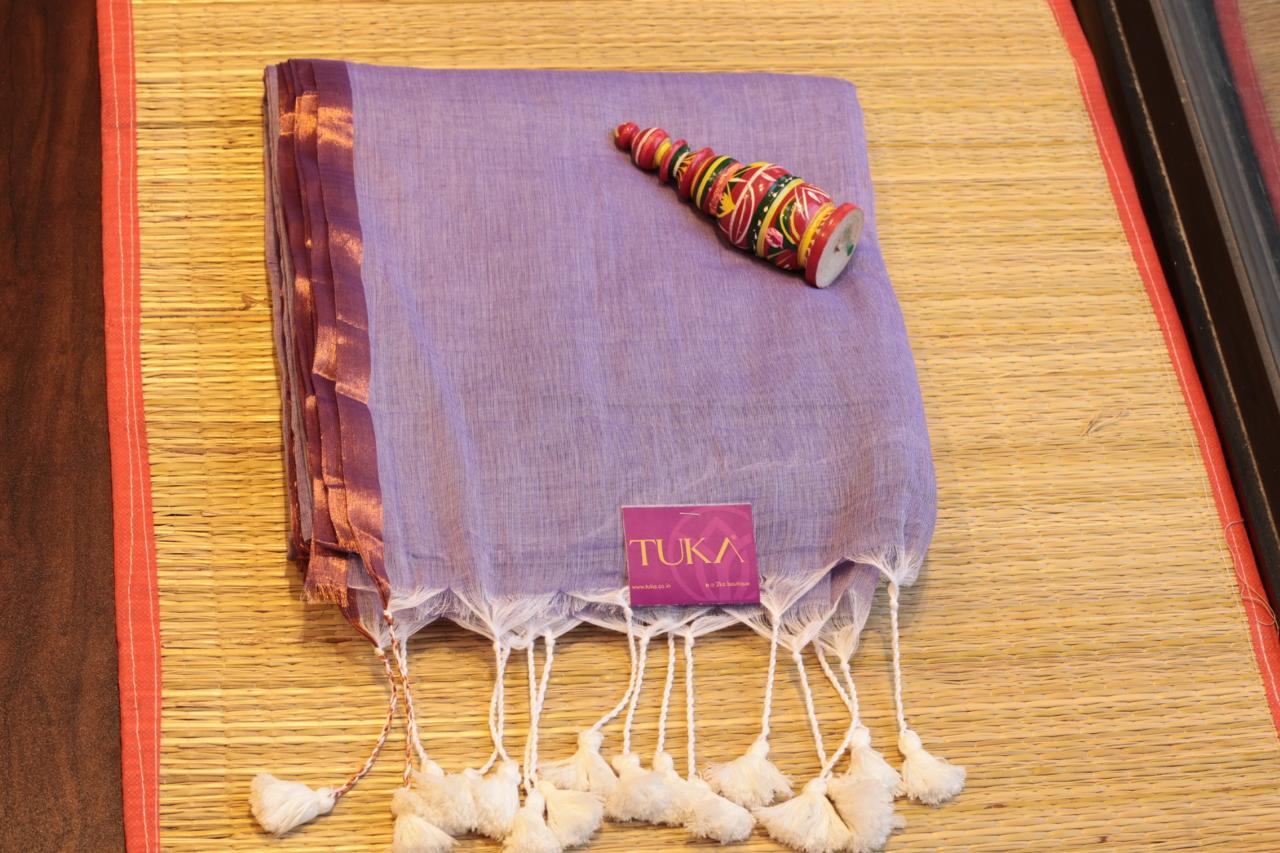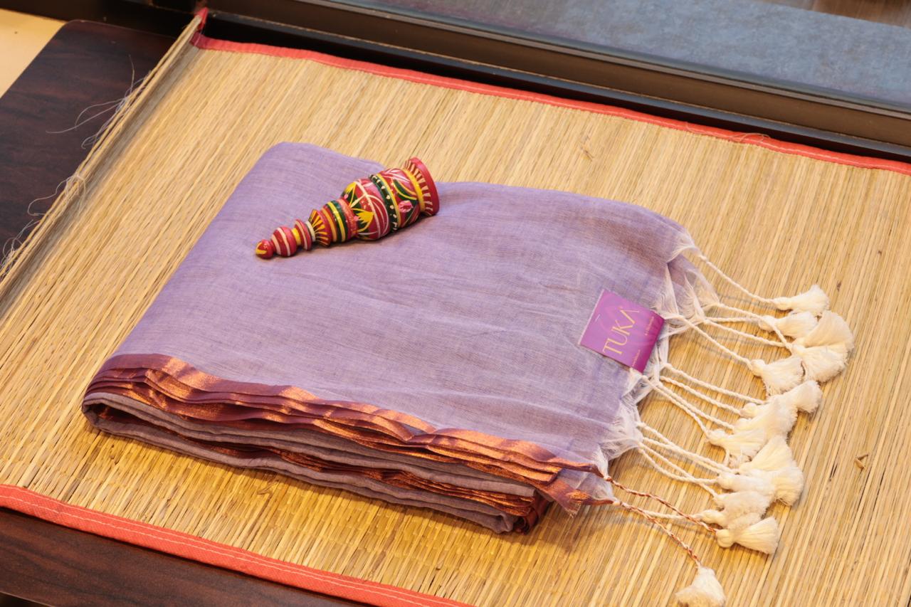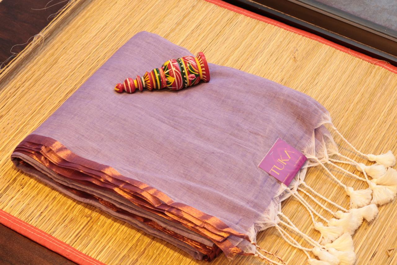 Embrace grace and sophistication with this lavender mul cotton handloom saree, a perfect fusion of tradition and modern elegance. The soft, breathable fabric ensures comfort, making it an ideal choice for all-day wear. The saree features a rich copper-toned border, adding a subtle contrast and a luxurious touch to its overall appeal.