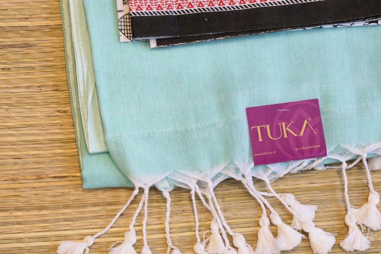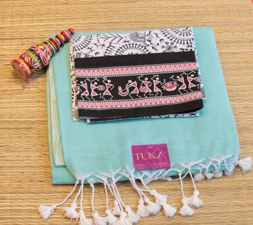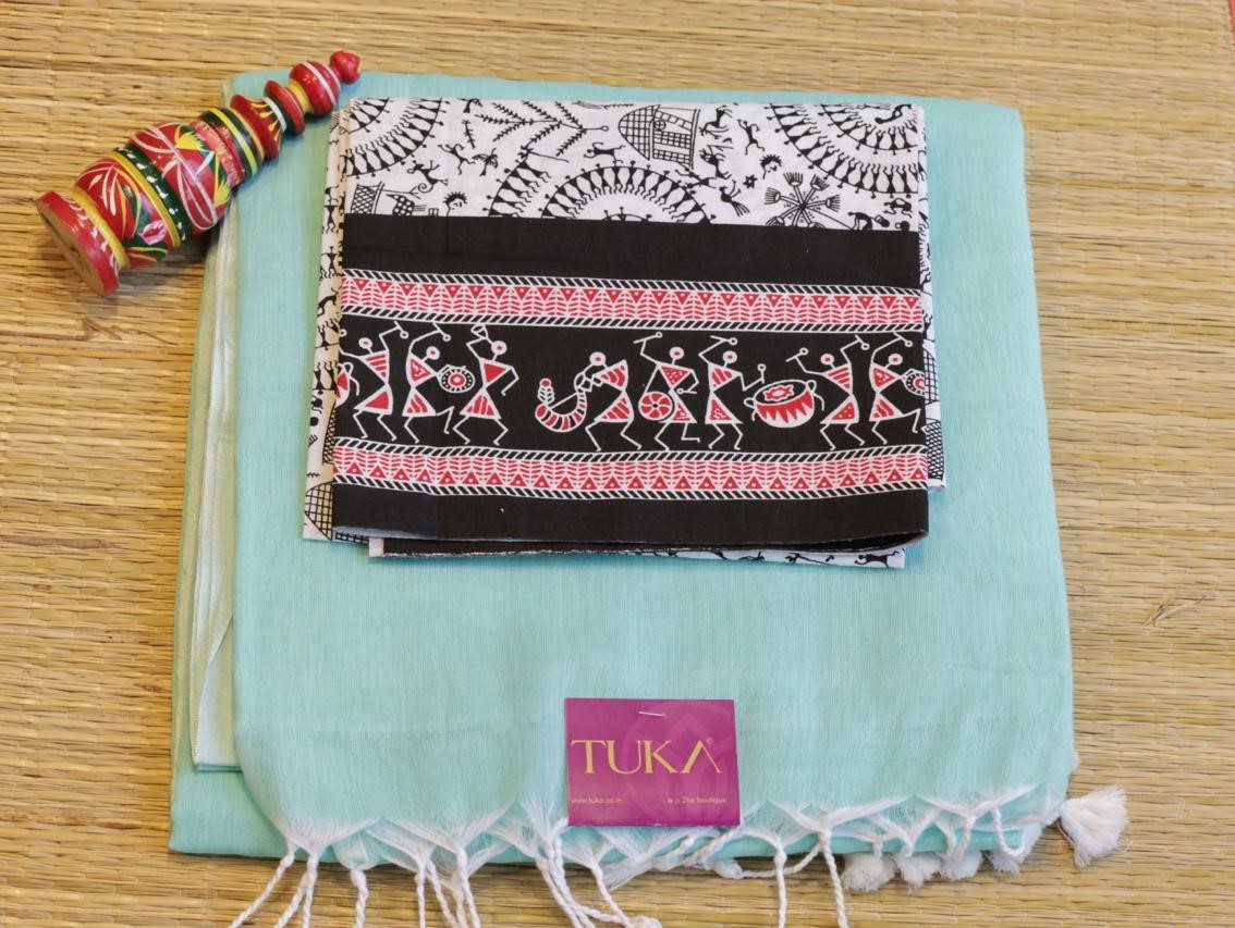 Celebrate the beauty of Indian heritage with this exquisite handcrafted Warli print cotton saree. Designed with intricate tribal motifs in classic black and white, the saree tells a story of art, culture, and tradition. The elegant aqua blue pallu, adorned with delicate white tassels, adds a refreshing contrast, making it a perfect blend of tradition and modern elegance.