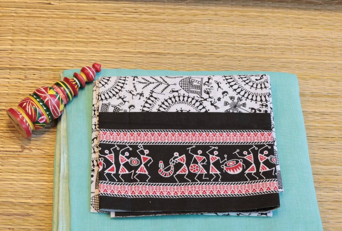 Be the first to review “Handcrafted Warli Print Cotton Saree – Black & White with Aqua Blue Pallu”